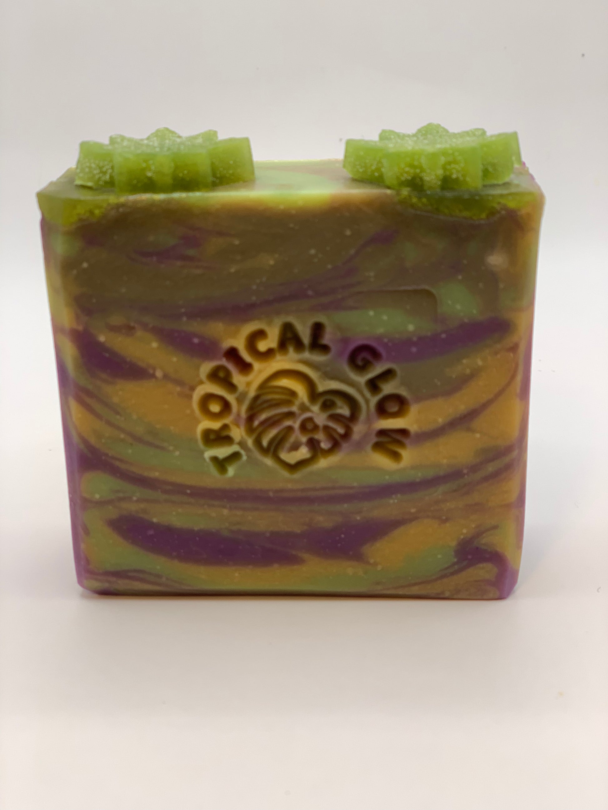 Ingredients: Saponified oils of rice bran, olive, hemp seed, kukui nut, coconut, babassu, and castor, shea butter, cocoa butter, kaolin clay, colloidal oats powder, chamomile tea, fragrance oil, mica.